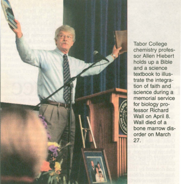 Chemistry professor Allen Hiebert said one of Wall's greatest interests was discussing how faith and science fit together. | Chemistry professor Allen Hiebert said one of Wall's greatest interests was discussing how faith and science fit together. | ||